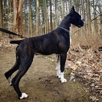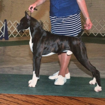 White Pines My Give A Damn's Busted (aka) Koal. Koal is from Ch. White Pines Black Orchid of Heart Acre and Ch. White Pines Legacy of Leo from Heart Acre. He is owned by myself and my son Todd Gasper. Koal was the only brindle in the litter and his litter mates looked at him as if they were saying "he's adopted, right"?